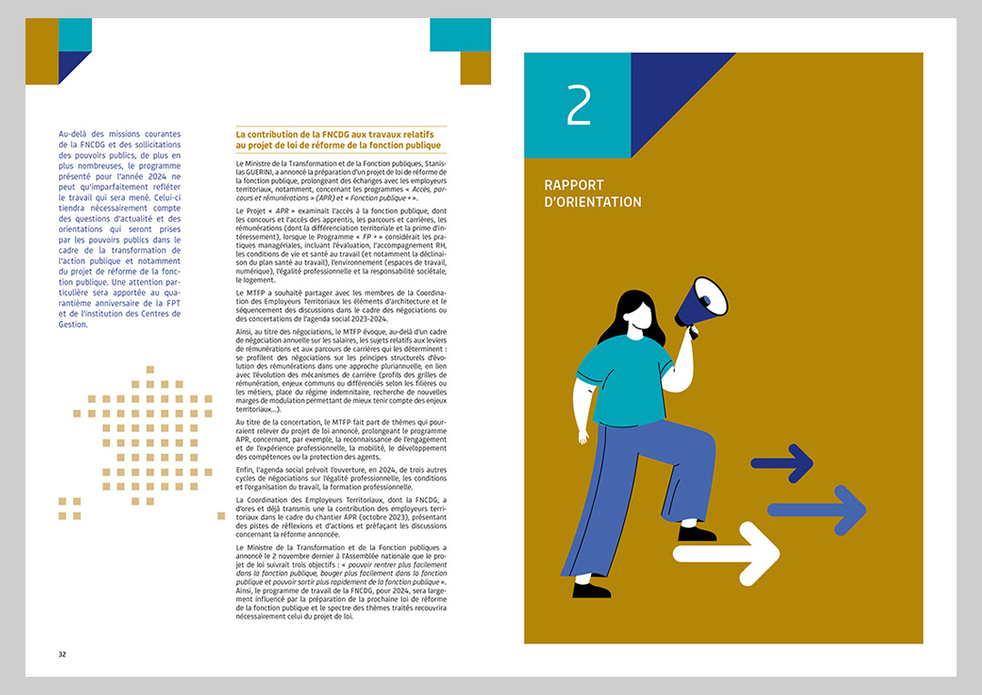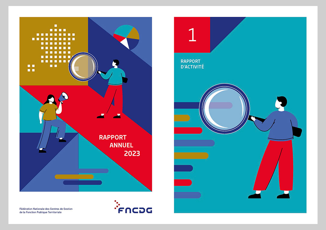 Rapport annuel 2023 pour la Fédération nationale des Centres de gestion de la fonction publique territoriale, création de la maquette et des illustrations.